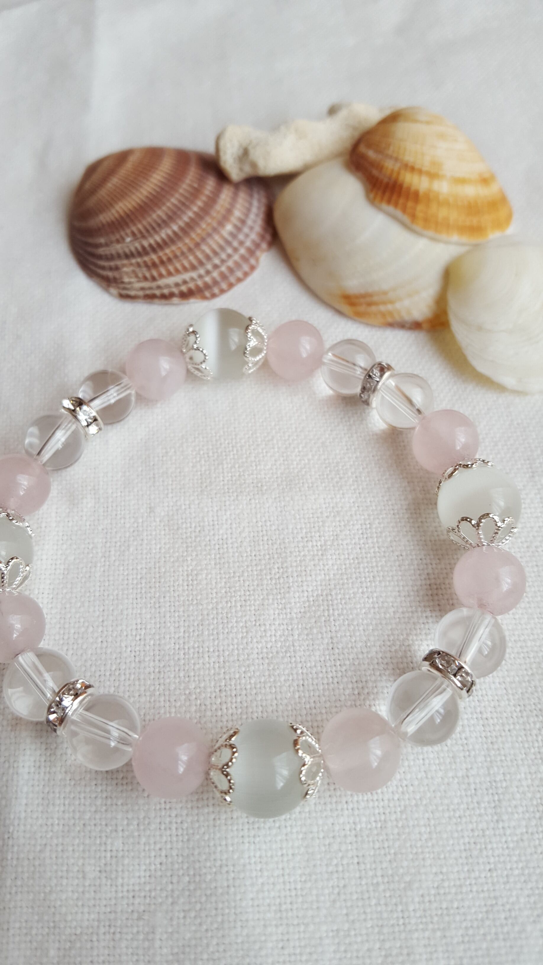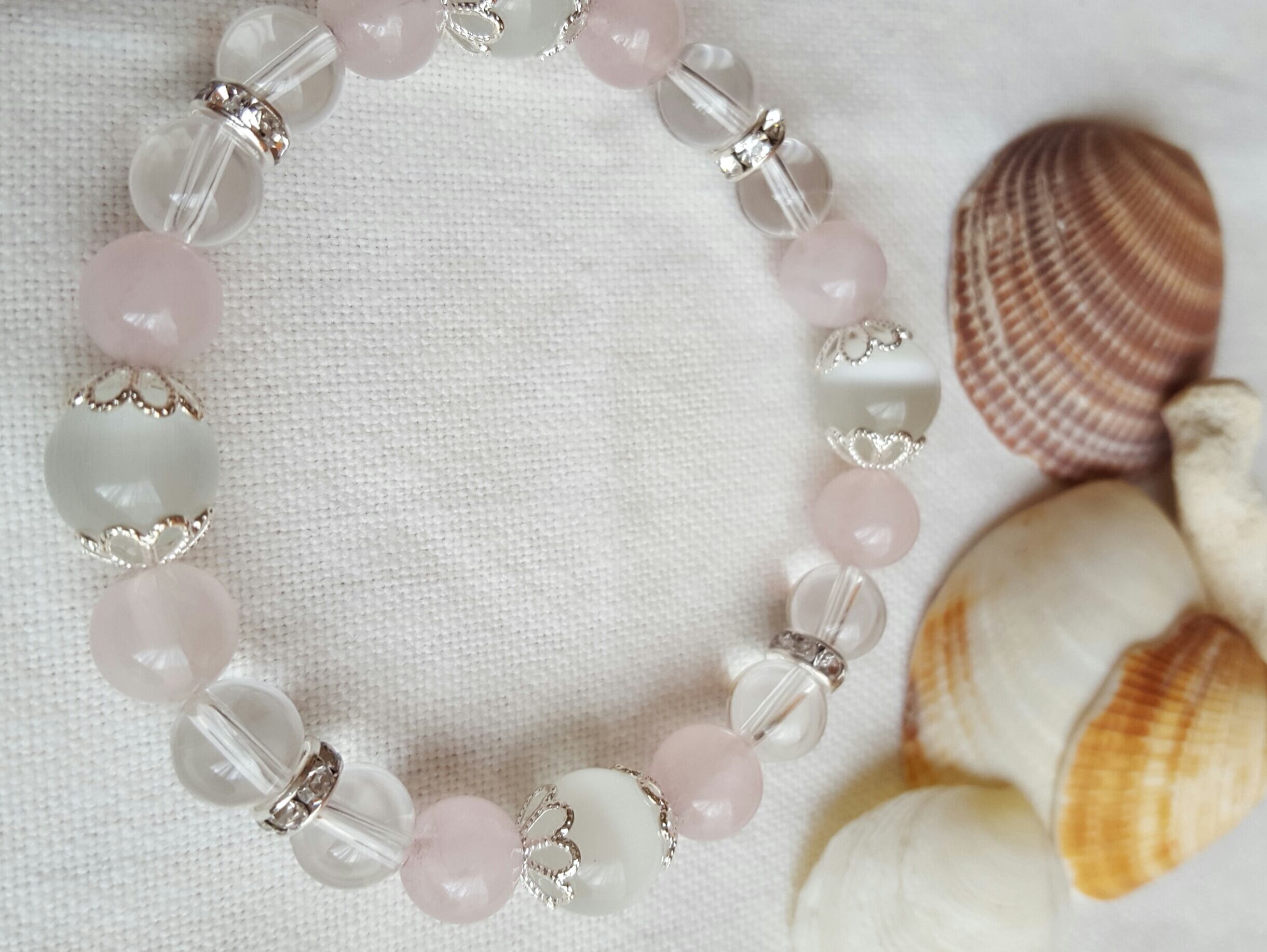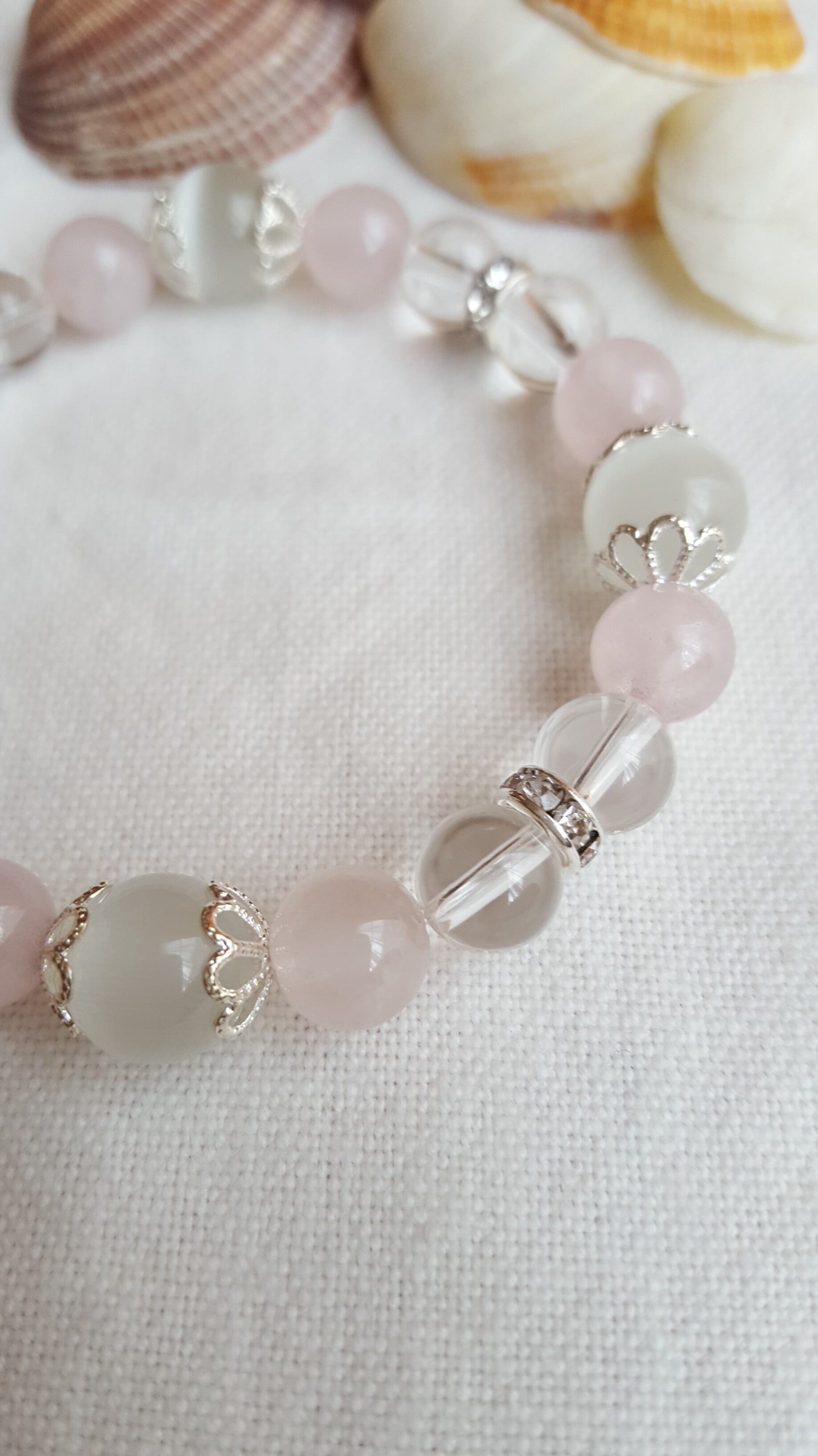 やさしくてかわいいローズクォーツと水晶のブレスレットができました。