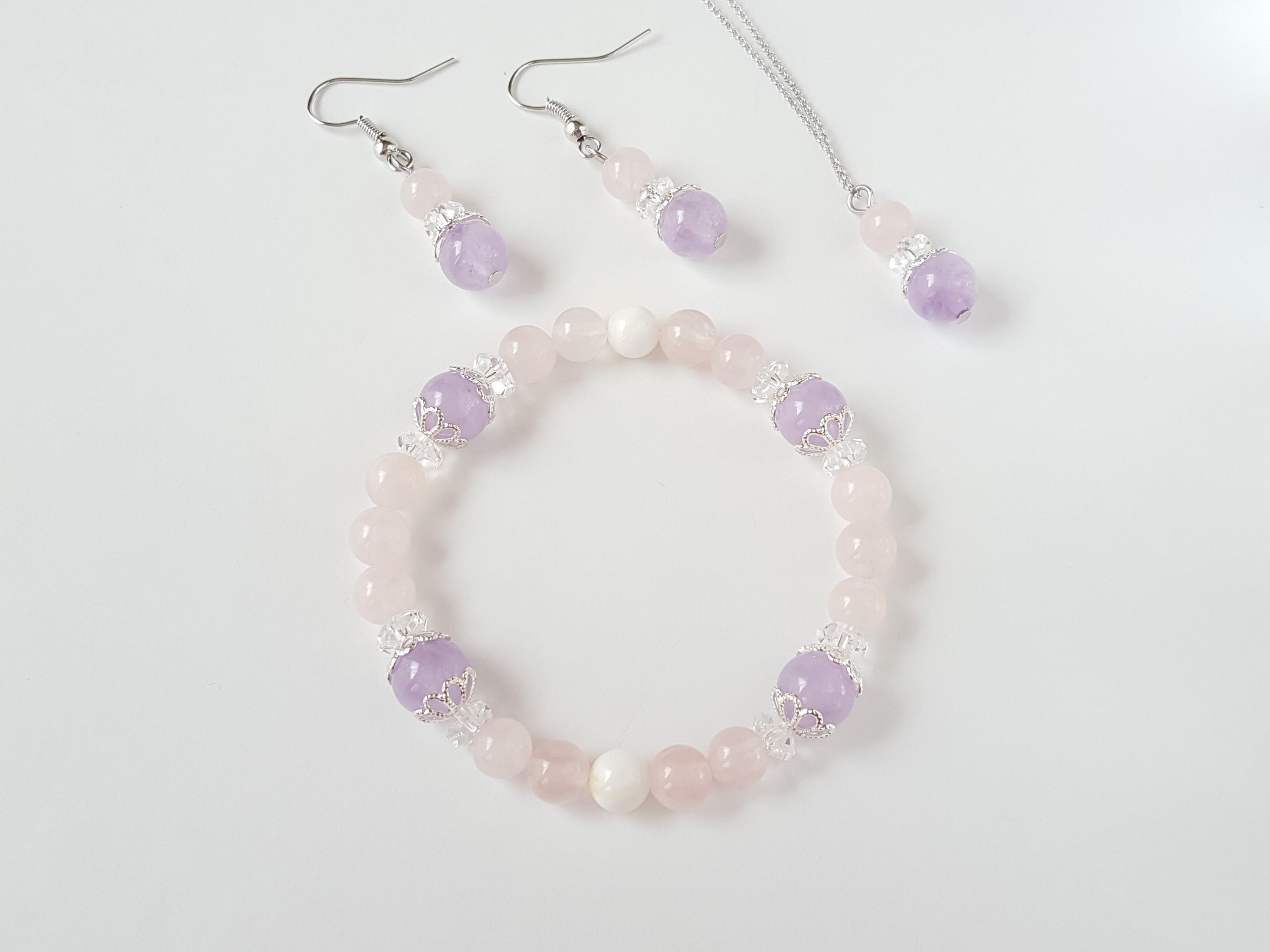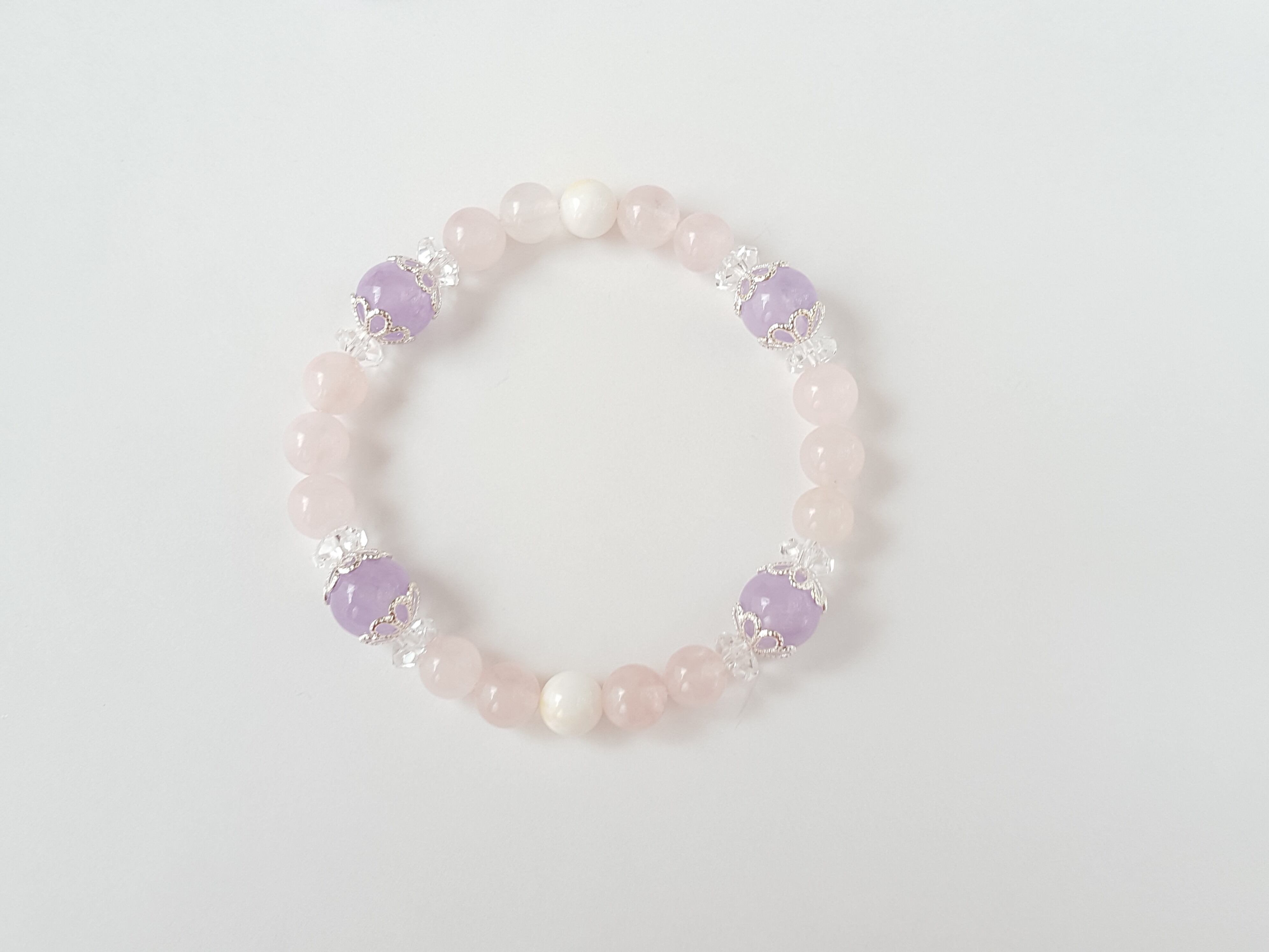 天然石のラベンダーアメジスト、ローズクォーツ、ボタンカット水晶を使用したやさしい色合いの上品でかわいいブレスレットです。