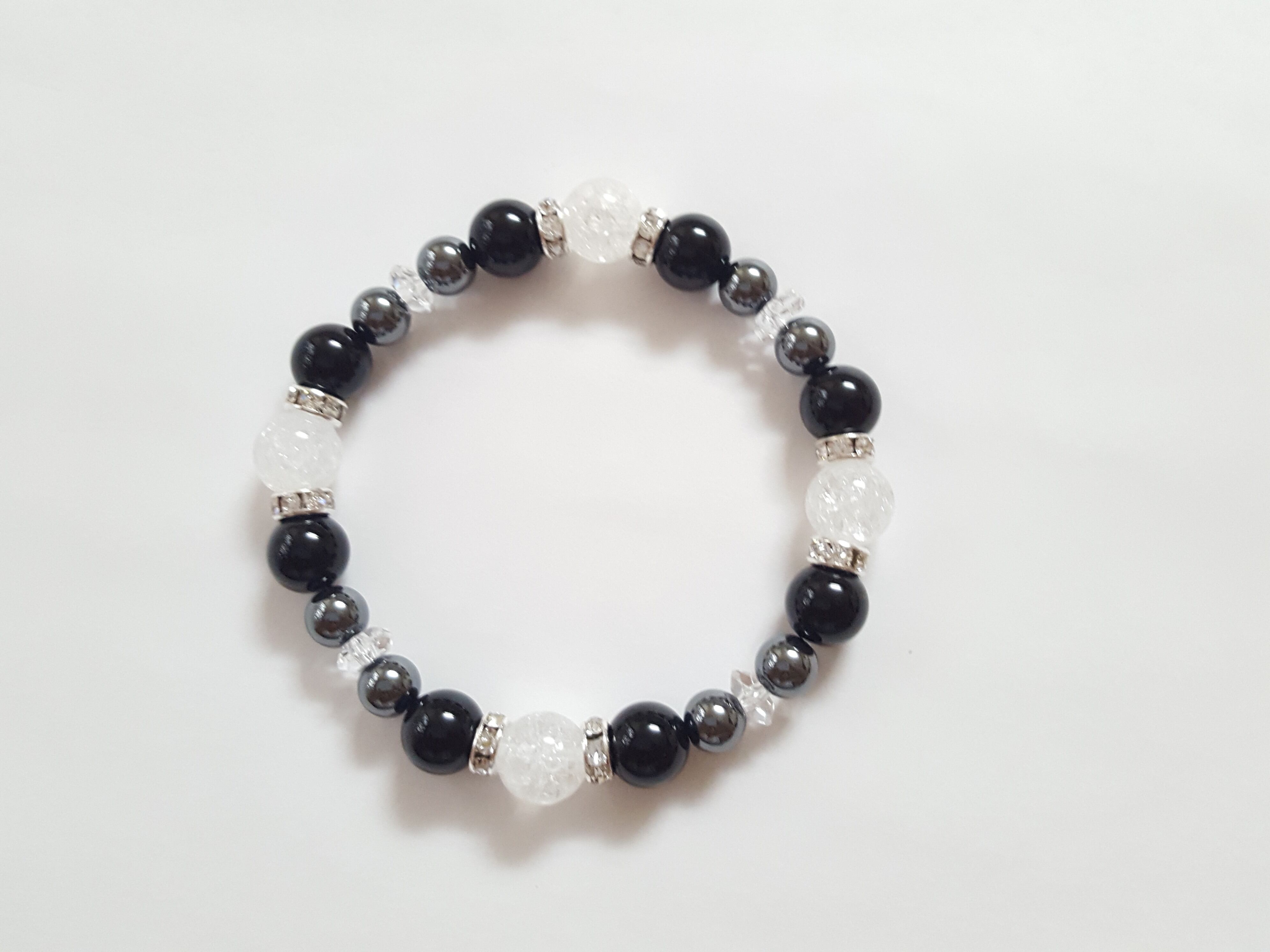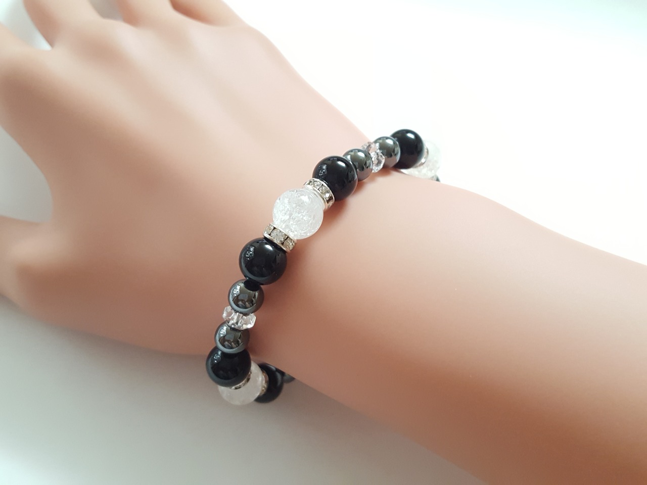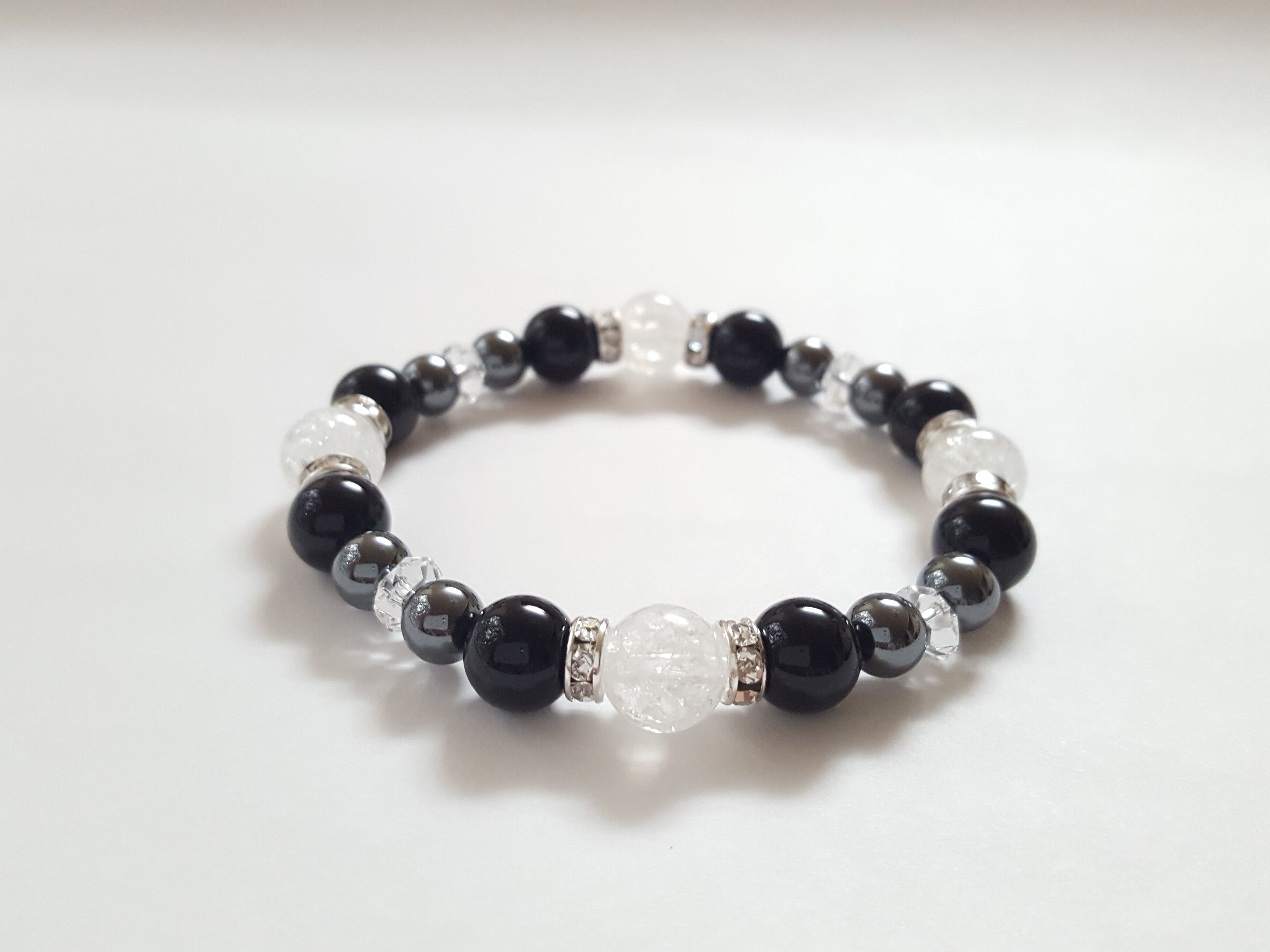 ロンデルとボタンカット水晶がキラキラ輝くモノトーンのブレスレットです。白、黒、グレーのグラデーションが手首をきれいに見せてくれます。